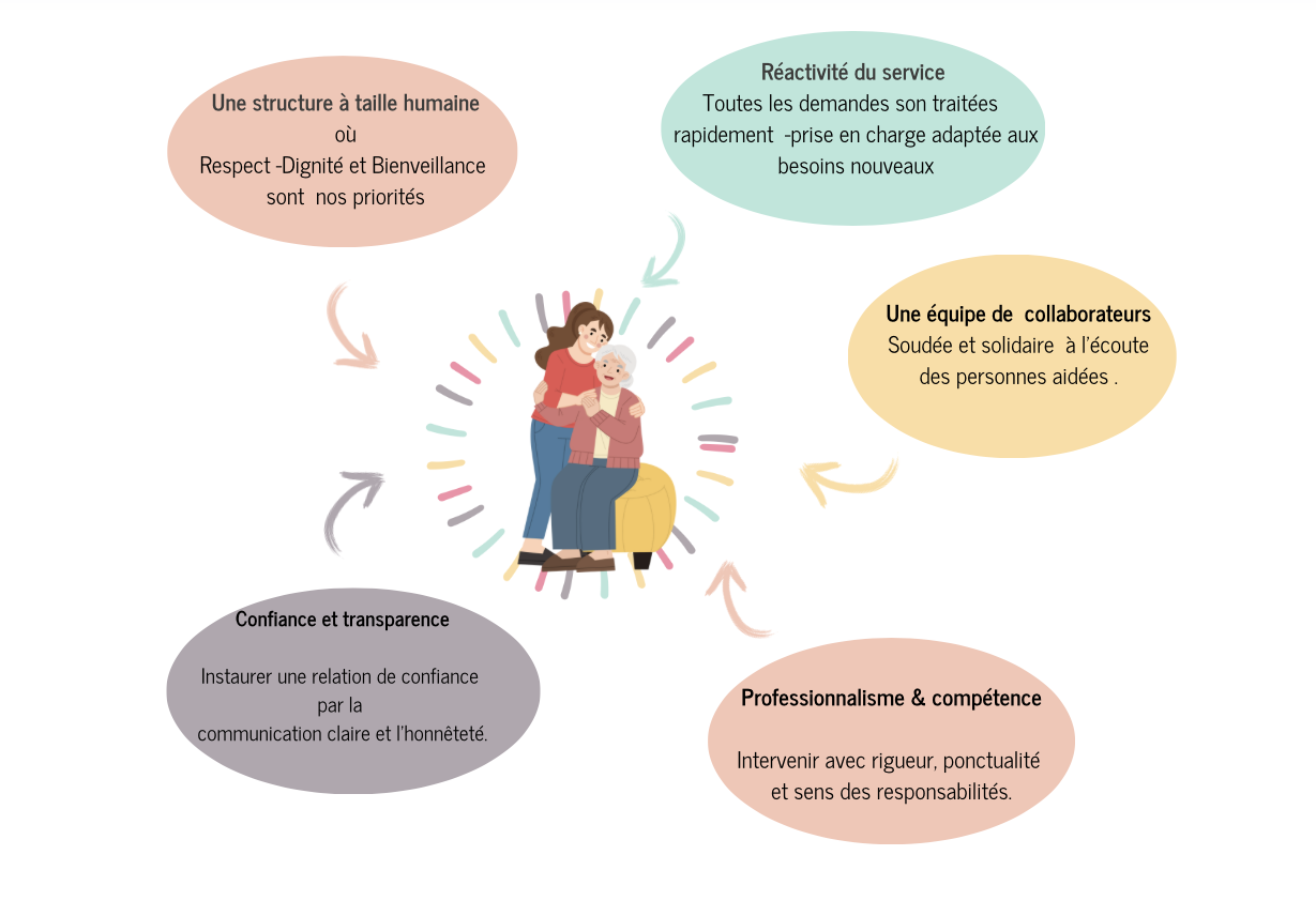 Notre structure est familiale, à taille humaine, elle met un point d'honneur à garantir le maintien à domicile des personnes âgées, leur offrant ainsi un cadre de vie confortable et sécurisé tout en restant acteur de leur quotidien grâce au travail et au dévouempent de l'ensemble de notre équipe .
